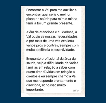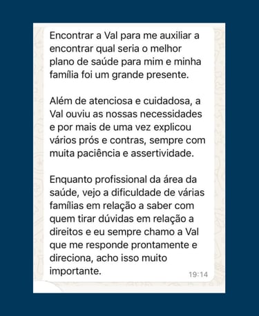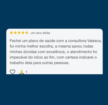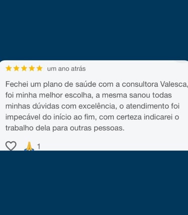 Olá, sou Valesca Messias. Com uma década de atuação no mercado de saúde suplementar, especializei-me em atender perfis exigentes que não podem depender da sorte quando o assunto é saúde.